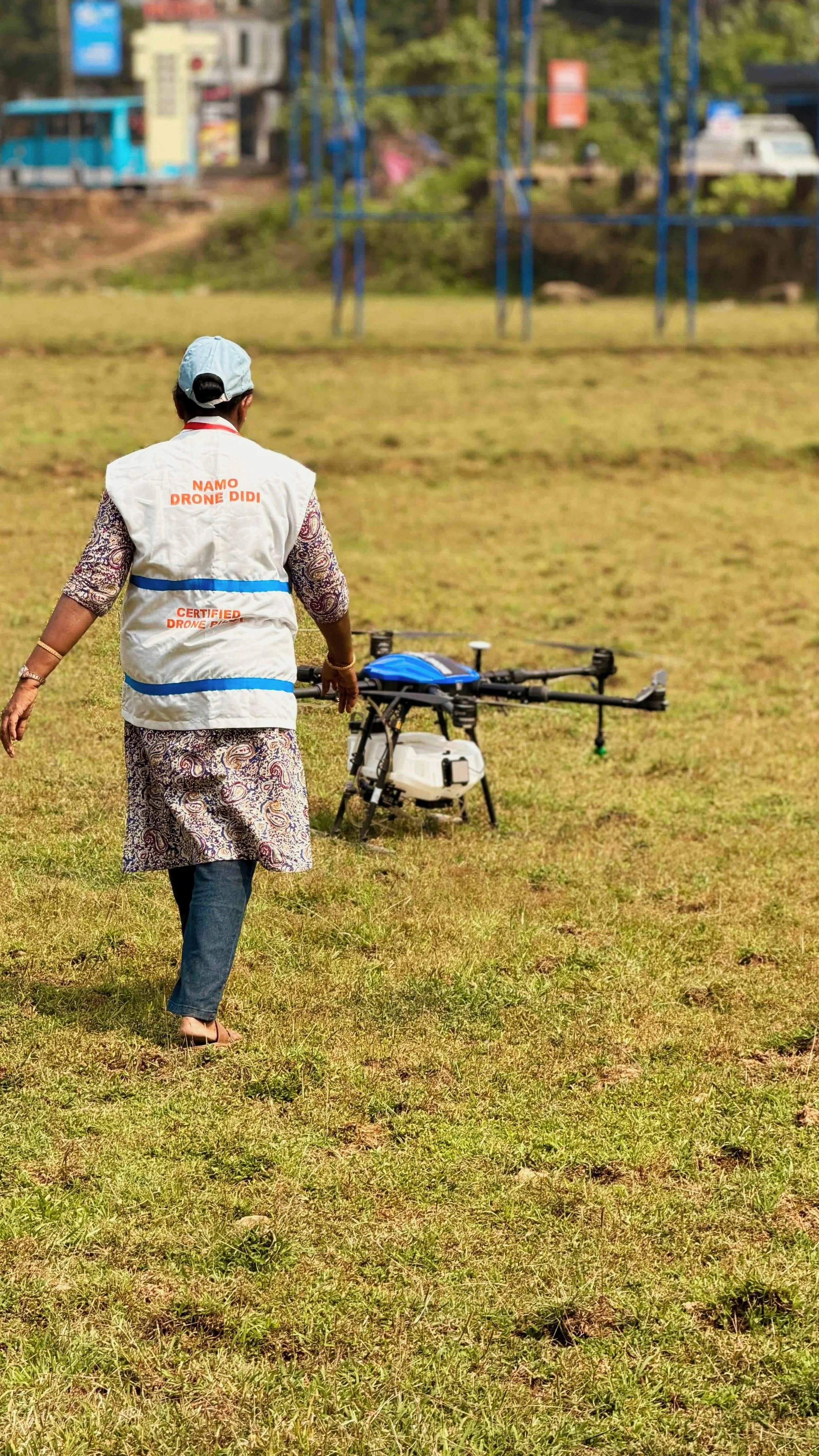 “The average woman in this area earns 500 rupees a day. As a certified drone pilot, she can earn 700 rupees in half an hour—and through her work, she is helping other women fertilize their fields more efficiently.”